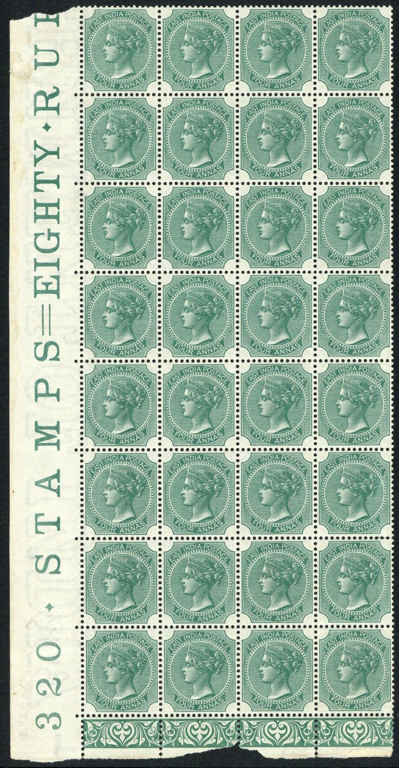 1866-78 4a. green Die I block of thirty-two (4x8) from the lower left corner of the pane, unmounted mint, fine and fresh. S.G. 69, £3,840+
