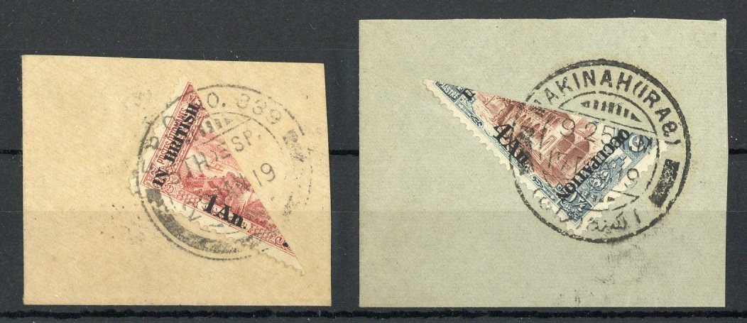 1918 1a. on 20pa. red and 4a. on 1¾pa. red-brown and grey, both bisected diagonally on individual pieces, tied by "f.p.o. no. 338" and "makinah(iraq)" double-ring d.s. of 1919 respectively, fine