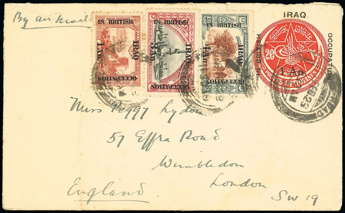 1923 (Feb.) 1a. on 20pa. stationery envelope "By Airmail" to London, uprated with 1a. on 20pa., 3a. on 1½pi. and 4a. on 1¾pi., all cancelled by Baghdad double-ring d.s. and showing, on reverse, a good strike of the "general head quarters/air mail/british forces in iraq" cachet in violet; vertical crease at left and faults (1a. defective) through opening. Photo
