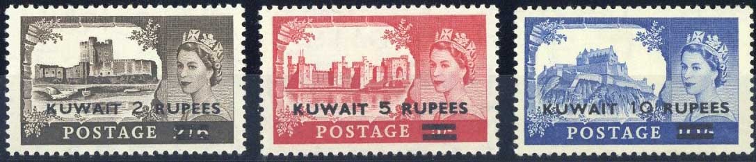 1957 Castle 2r. on 2/6d., 5r. on 5/- and 10r. on 10/- with Type II surcharges, fine mint. S.G. 107a-109a, £350