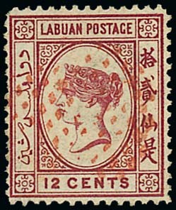 1879 12c. carmine, variety no right foot to second Chinese character [R2/3], red dots cancellation, a couple of slightly short perfs., otherwise fine and scarce. S.G. 3a, £1,600. Photo