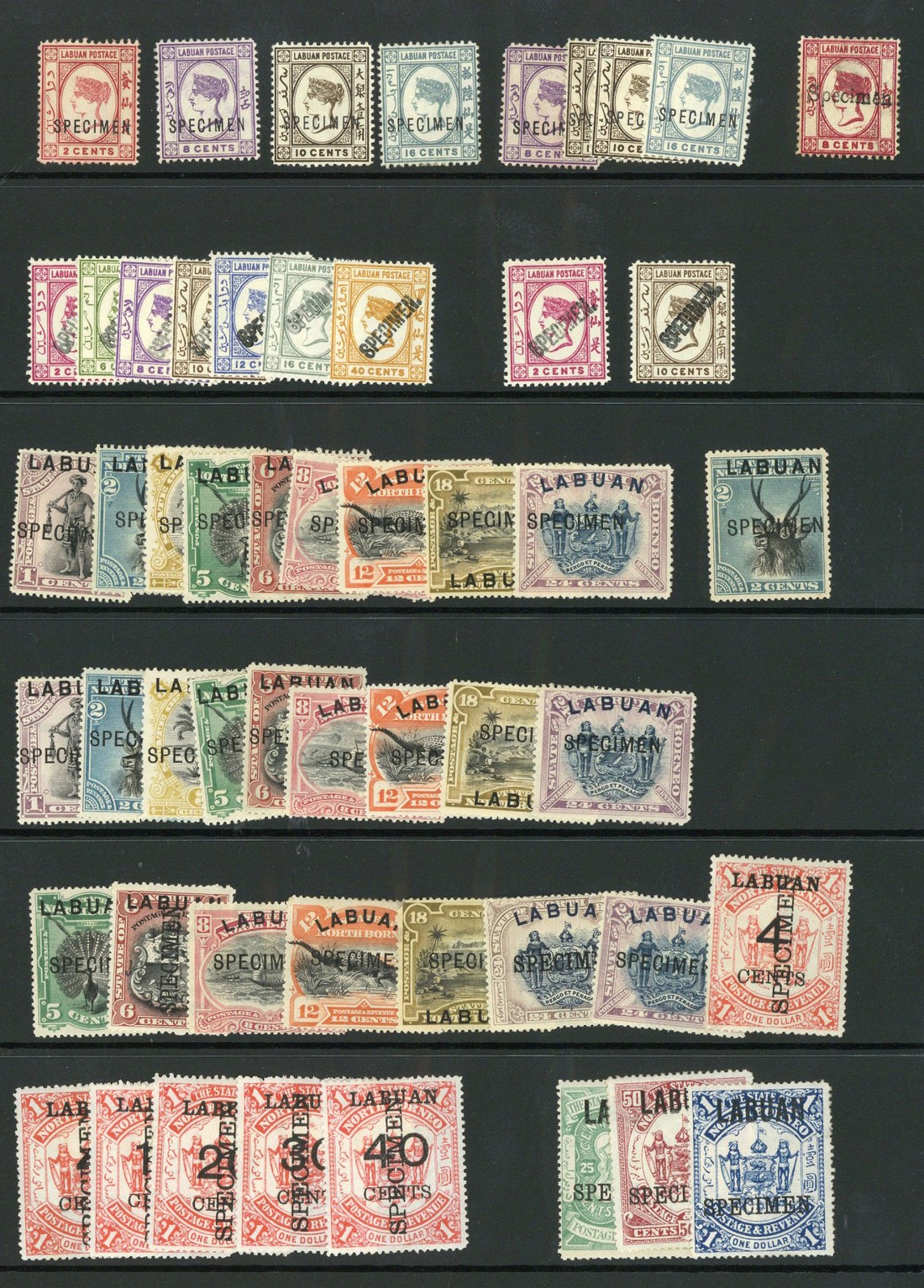 1880-1903 selection (128) with some duplication, all overprinted or handstamped "specimen" and including 1880-82 8c. carmine (defects) with local handstamp Type LAI, 1885-86 2c. to 16c., 1894 2c. to 40c., 1894-96 1c. to 24c., 1895 Surcharges, 1899 Surcharges and 1902-03 1c. to $1 (without gum); generally good to fine. S.G. between 7s and 128s, £1,100