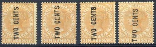 1883 (Apr.) "two cents" on 8c. orange, four examples showing Types 20a, 20b, 20c and 20d, and "two cents" on 32c. red Type 20f, all unused with varying amounts of original gum, fine. S.G. 54-57, 60, £2,360