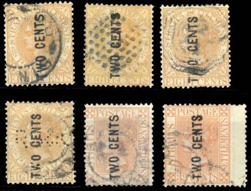 — "two cents" on 8c. orange Types 20a, 20b, 20c, 20d (with perfins) and 20e, and "two cents" on 32c. pale red Types 20a and 20f, all used, the last with part manuscript mark, generally fine. S.G. 54-60; £1,695