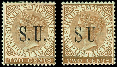 1882 "S U" overprints on 2c. brown (2), with and without stops, fine unused with part and large part original gum respectively. S.G. 12-13, £600