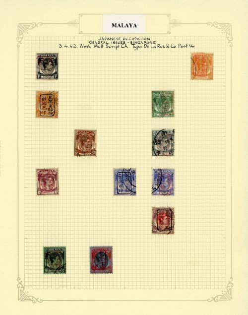 Straits Settlements 1c., 2c. orange, 3c., 5c., 8c., 10c., 15c., 50c. and $1 with chop in red, 2c. orange, 12c. and 40c. with chop in black, fine used. Cat. £600+