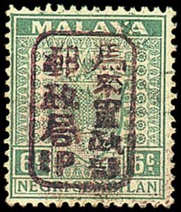 Negri Sembilan 6c. grey with chop in brown (Type E), fine and lightly cancelled; also kanji 6c. (Type 21) on 5c. brown, variety overprint and surcharge inverted, mint. S.G. J165a, 268a, £600