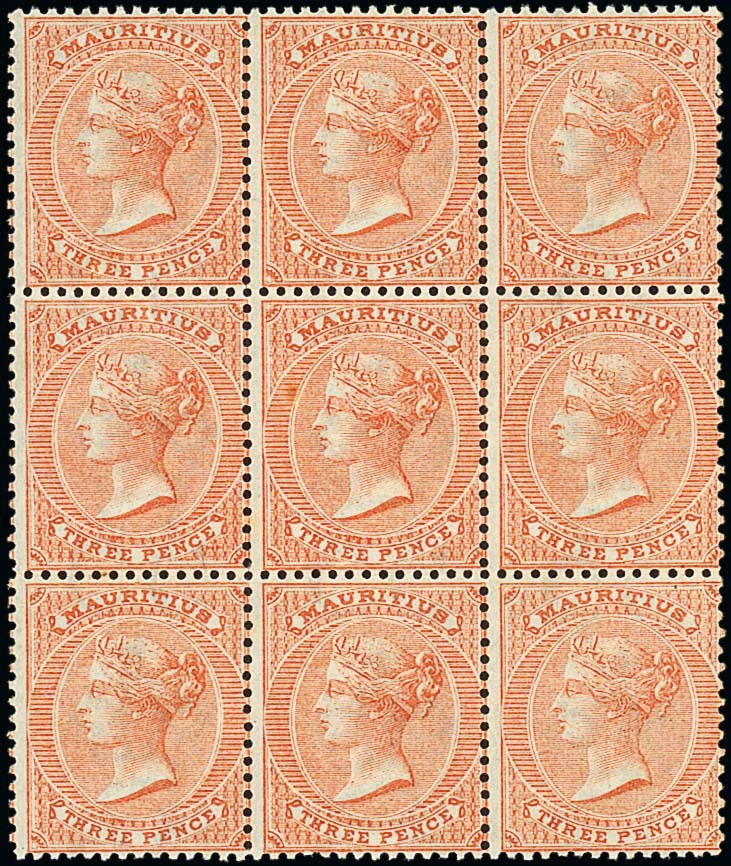 — 3d. dull red block of nine, large part original gum, a few small gum tones, otherwise fine and a scarce multiple. S.G. 61a, £765+. Photo