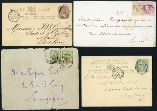 1863 (4 Apr.) envelope to France bearing 4d. rose and 1/- yellow cancelled "B53" with "p.d." and Marseilles c.d.s. in red alongside, 1884 2c. brown card from Union Vale to Port Louis cancelled "15", 1892 6c. green card from Quatre Bornes to London cancelled "21" and 1907 envelope (edge faults) from Rodrigues to Singapore bearing 3c. pair each with c.d.s.