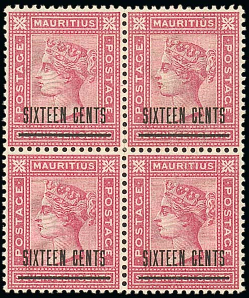 1883 (July) 16c. on 17c. block of four, part or large part original gum; folded through the perforations. Scarce. S.G. 115, £440+. Photo