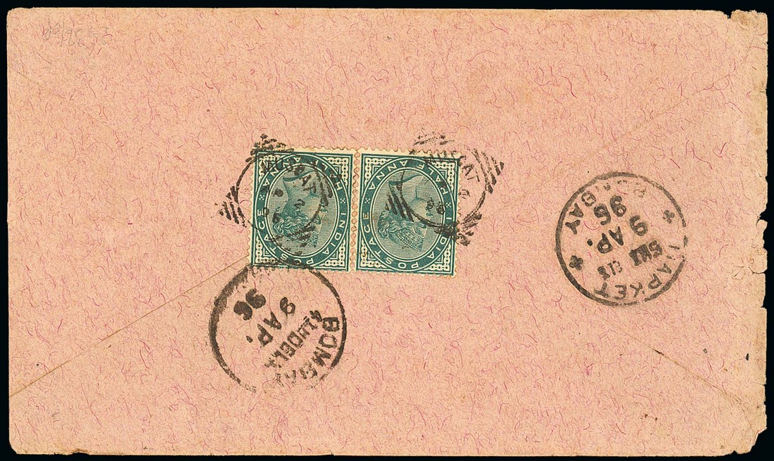 1896 (2 Apr.) pink envelope to Bombay, bearing, on reverse, India 1882-90 ½a. (2) with small squared circle "muscat" datestamps; the envelope with slight perimeter faults at right, otherwise fine. Photo