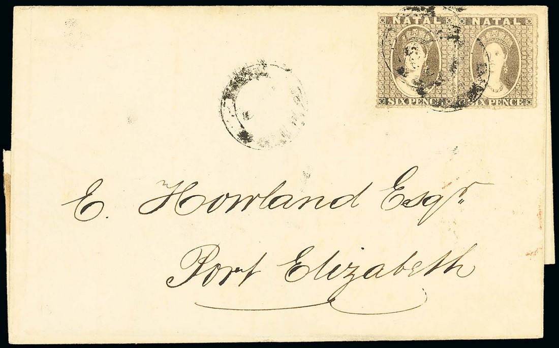 1862 entire to Port Elizabeth, bearing 1862 rough perf 14 to 16 6d. grey pair tied by Durban c.d.s. and showing, on reverse, red arrival d.s. (7.6). Photo