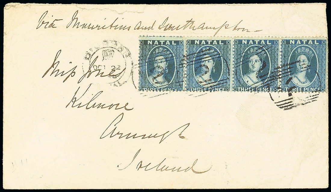 1866 (22 Oct.) envelope "Via Mauritius and Southampton" to Ireland, bearing 1861 intermediate perf 14 to 16 3d. blue strip of four tied by barred numeral "2", showing Durban c.d.s. alongside and, on reverse, clear arrival d.s. (21.12). Photo