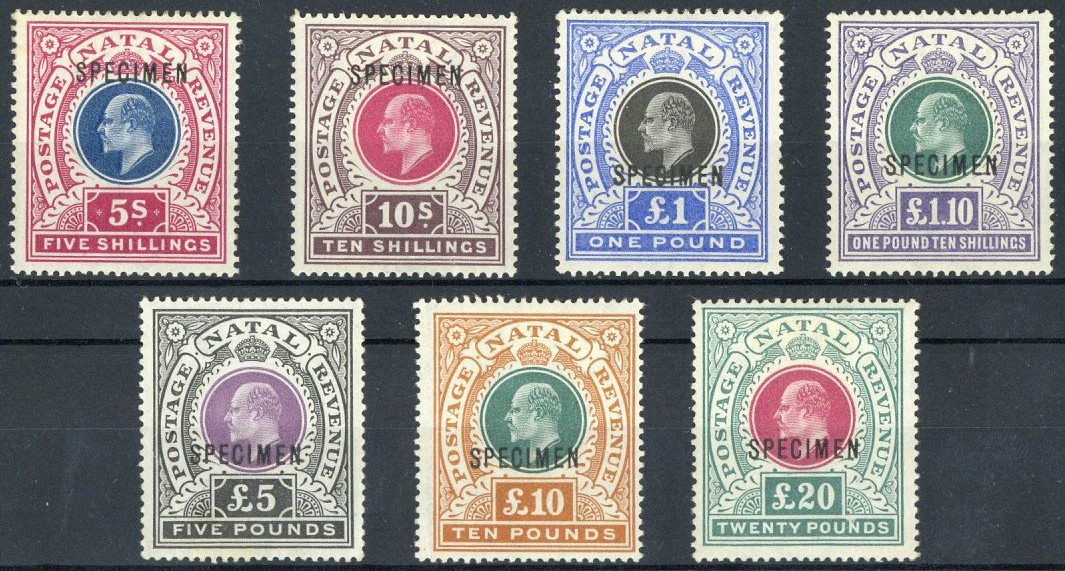 1902 5/- to £20 each overprinted "specimen" (D12), large part original gum; 5/- and 10/- fractionally toned, diagonal crease on £5, good appearance. S.G. 140s-145bs, £1,405