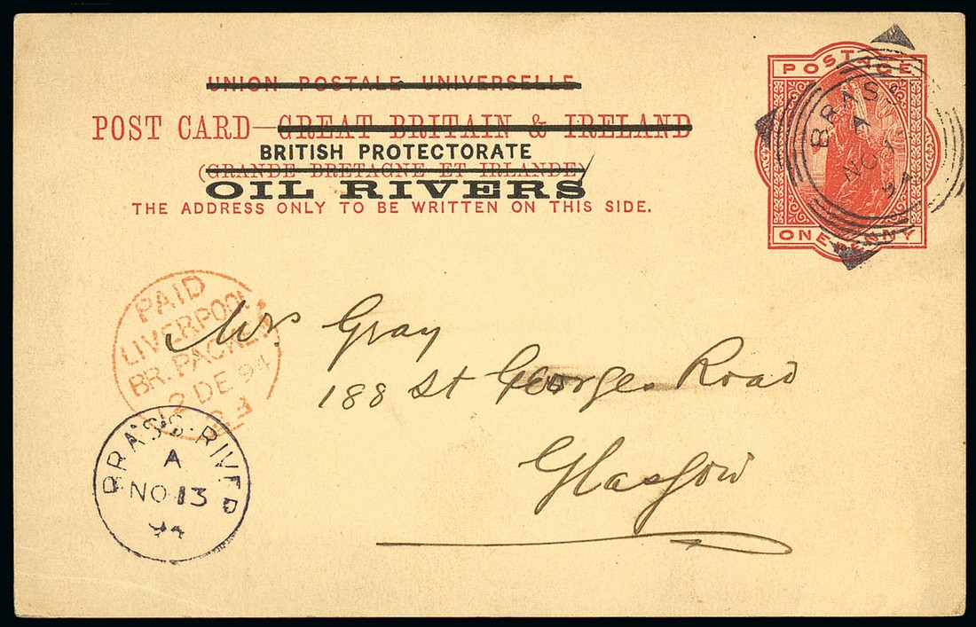 1894 (13 Nov.) 1d. stationery card to Glasgow, cancelled by "brass" squared-circle d.s. (Type D4) and showing fine "brass river" c.d.s. (Type D2) with code "A" in opposite corner partly overstruck by red Paid Liverpool Br. Packet c.d.s. (12.12). Attractive. Photo