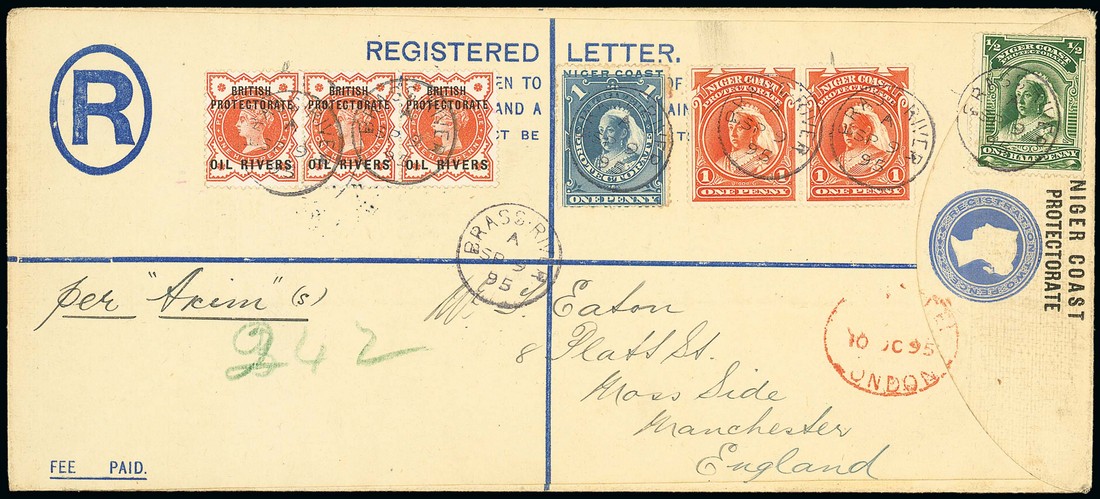 1895 (9 Sept.) 2d. registered envelope (size ) to Manchester, bearing 1892 ½d. strip of three, 1894 (Jan.) 1d. (some lightly stained perfs) and 1894 (May) ½d. and 1d. pair, all cancelled by "brass river" c.d.s. with code "A" (Type D2) in violet-black, showing another fine strike alongside and red London transit d.s. (10.10). Photo