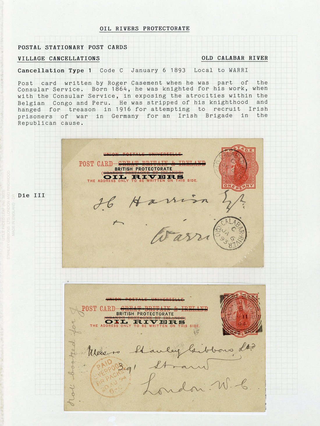 1893 (6 Jan.) 1d. stationery card to Warri, written by Roger Casement, cancelled by light "old calabar river" code "C" c.d.s. (Type D2) and showing another clearer strike below; also 1894 (11 July) 1d. stationery card addressed to Stanley Gibbons London, clearly cancelled by "old calabar river" squared-circle d.s. (Type D4) with code "B". An interesting pair of cards