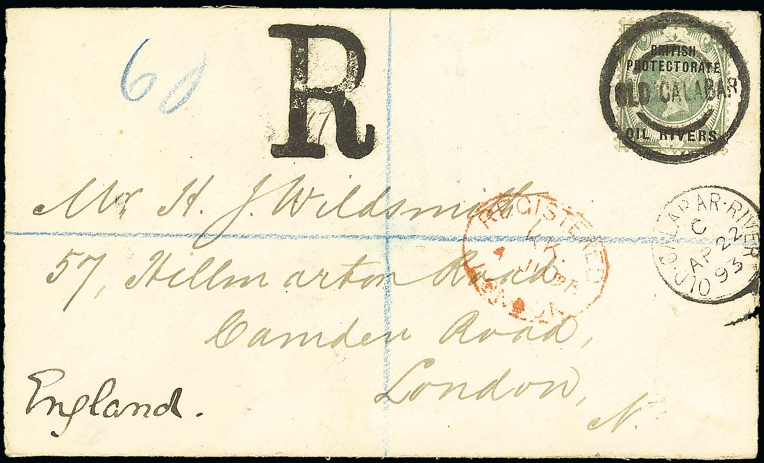 1893 (22 Apr.) front registered to London, bearing 1892 1/- clearly tied by "old calabar" double-ring parcel post h.s. (Type PP1) with "old calabar river" c.d.s. with code "C" (Type D2) alongside, showing large "R" h.s. (Type R1; earliest recorded date) and red Registered London arrival d.s. (4.6). Rare. Photo