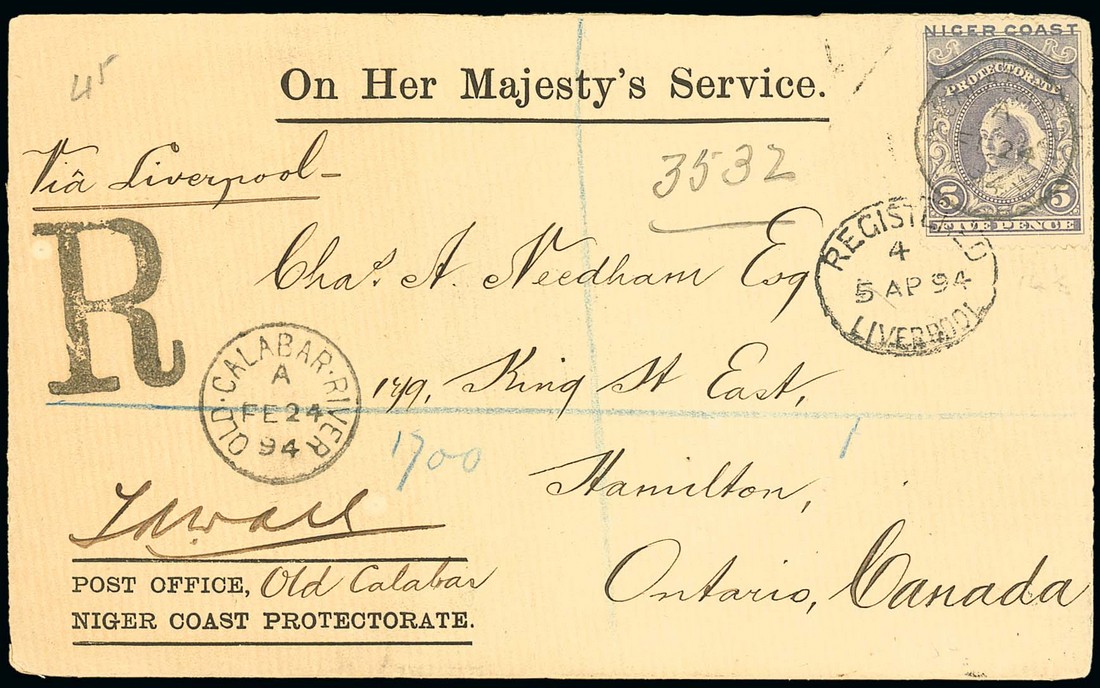 1894 (24 Feb.) OHMS envelope registered to Canada, bearing 1894 (Jan.) 5d. tied by light "old calabar river" c.d.s. (Type D2) and Liverpool transit d.s., showing large "R" h.s. (Type R1) with Hamilton arrival c.d.s. (17.4) on reverse. A neat and attractive franking. Photo