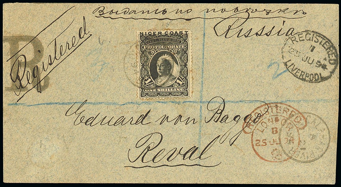 1894 (21 May) envelope registered to Reval, Russia, bearing 1894 (Jan.) 1/- tied by light "old calabar river" c.d.s. (Type D2), showing another strike at lower right overstruck by red London transit d.s. (25.6), large "R" h.s. (Type R1) with arrival d.s. on reverse. An unusual destination. Photo