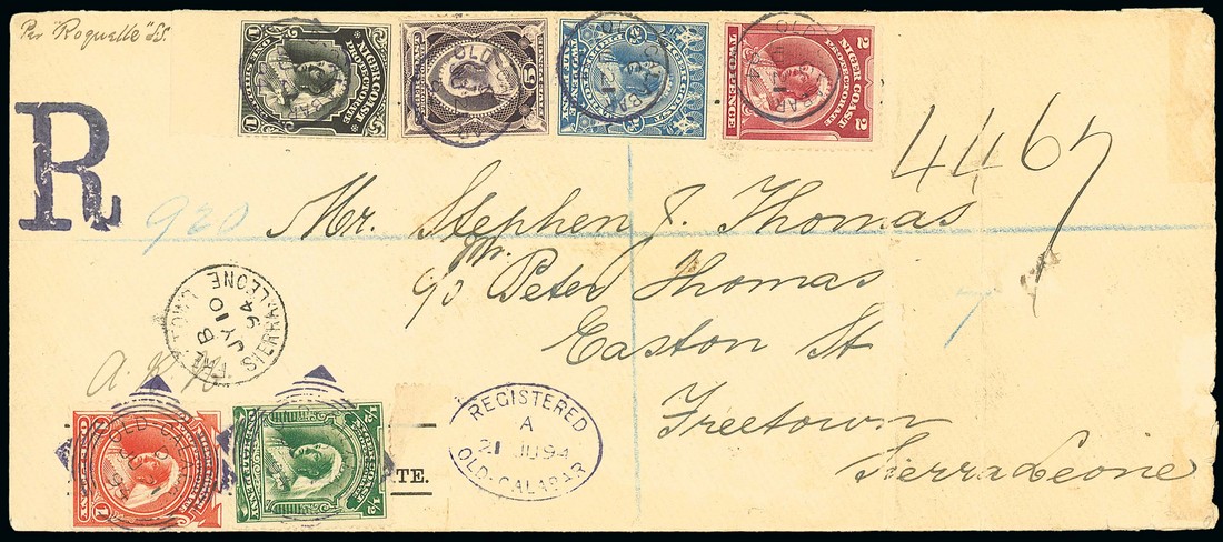1894 (21 July) envelope (223x96mm) registered to Sierra Leone, bearing 1894 (May) ½d. and 1d. tied by "old calabar" squared-circle d.s. with code "D" (Type D4), and 2d., 2½d., 5d. and 1/- tied by "old calabar" c.d.s. with code "C" (Type D5) and showing "R" h.s. (Type R1) and "registered/old calabar" oval d.s. (Type R6), all struck in violet, also showing Freetown arrival c.d.s. (10.7); the envelope with two vertical creases clear of adhesives. Photo