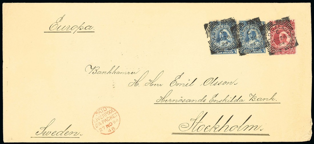 1894 (26 Oct.) envelope (255x115mm.) to Stockholm, bearing 1894 (Jan.) 2d. and (May) 2½d. (2), each crisply cancelled by "old calabar river" squared-circle d.s. (Type D4) and showing red Paid Liverpool Br Packet c.d.s. (27.11). Photo