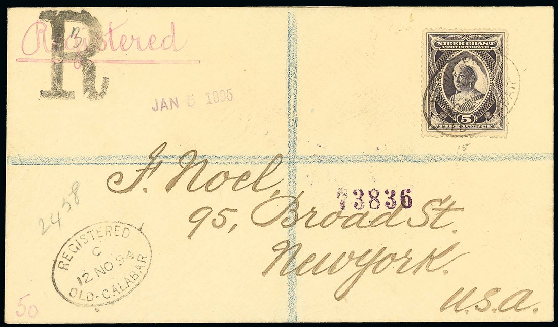 1894 (12 Nov.) envelope registered to New York, bearing 1894 (May) 5d. tied by "registered/old calabar" oval d.s. with code "C" (Type R6), showing large "R" h.s. (Type R1) with Liverpool and arrival d.s. on reverse. Photo