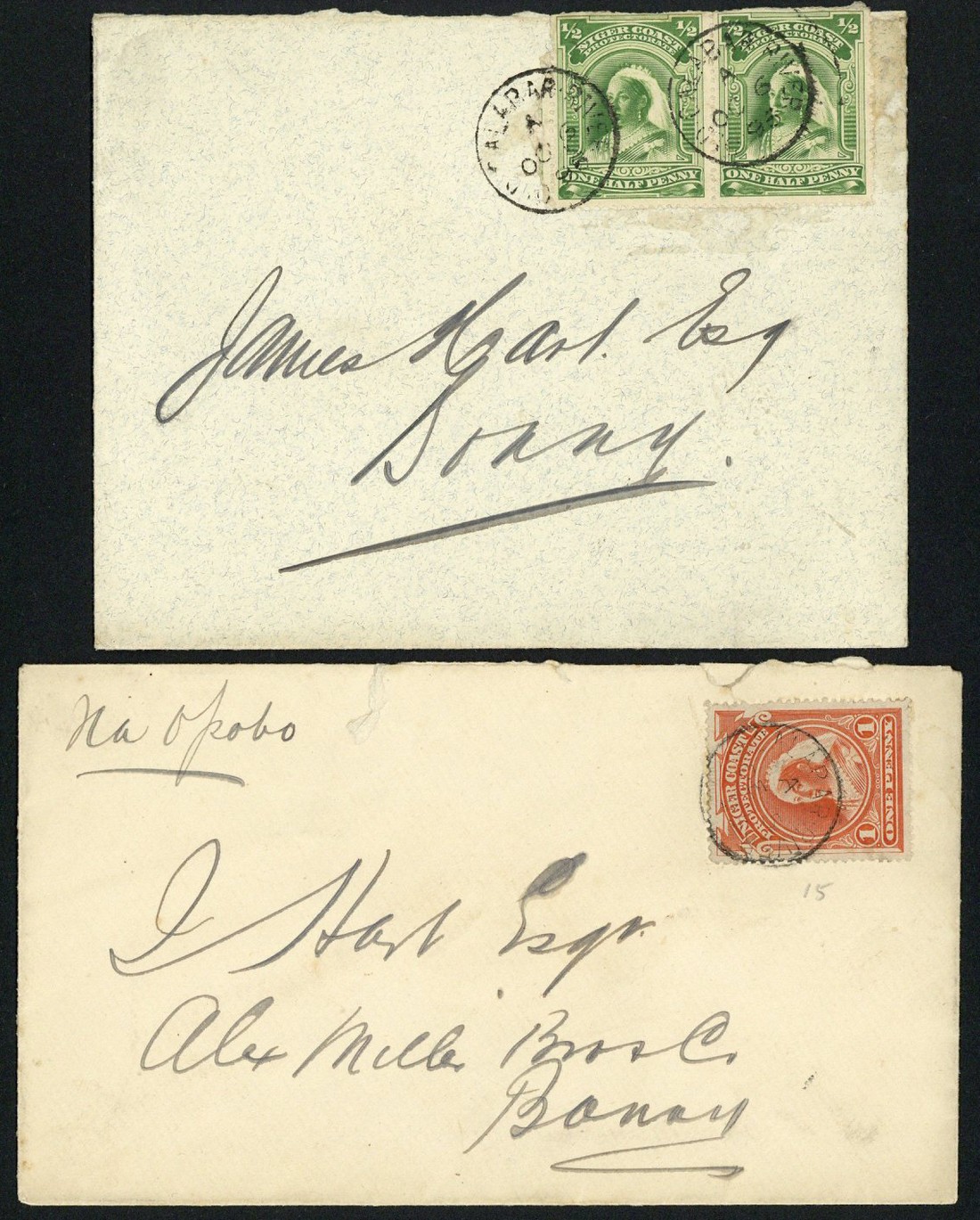 1894 (20 Nov.) envelope to London, bearing 1894 (May) 2½d. tied by "old calabar river" c.d.s. (Type D2), showing another strike in opposite corner and Paid Liverpool Br Packet c.d.s. (25.12) in red alongside; the envelope with some faults