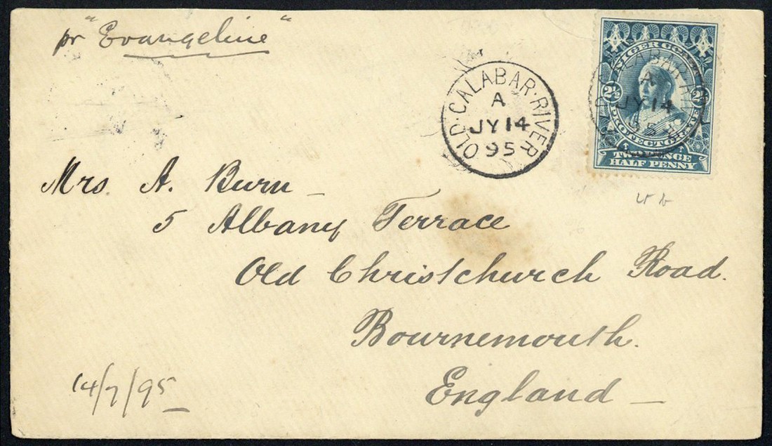 1895 (14 July) envelope to Bournemouth, marked "pr Evangeline", bearing 1894 (May) 2½d. tied by "old calabar river" c.d.s. with code "A" (Type D2), showing another fine strike alongside and, on reverse, "plymouth/ship letters" c.d.s. (11.18)