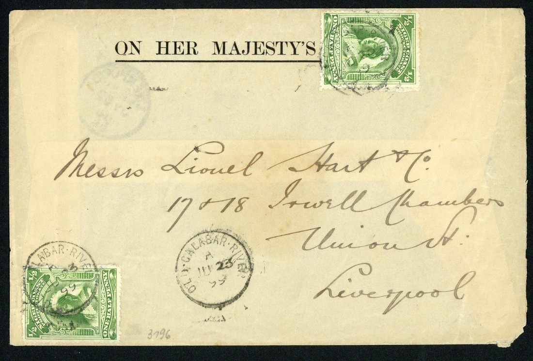 1899 (23 June) OHMS envelope to Liverpool, bearing 1897-98 ½d. (2) tied by scarce "old calabar river" c.d.s. (Type D8), showing another strike on face with arrival d.s. (22.7) on reverse