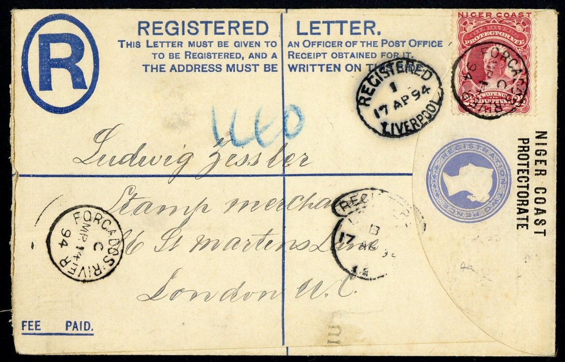 1894 (14 Mar.) 2d. registered envelope to London, bearing 1894 (Jan.) 2½d. tied by "forcados river" c.d.s. with code "C" (Type D2), showing another clear strike in opposite corner, with Liverpool and arrival (17.4) datestamps