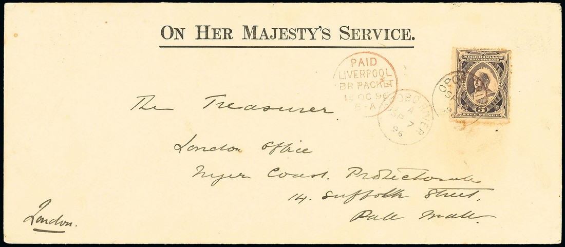 1896 (7 Sept.) OHMS envelope (22296mm.) to London, bearing 1894 (May) 5d. tied by "opobo river" c.d.s. with code "A" (Type D2) in brown, showing another strike alongside and Paid Liverpool Br Packet c.d.s. in red; the 5d. with some light discolouration around perfs. Photo