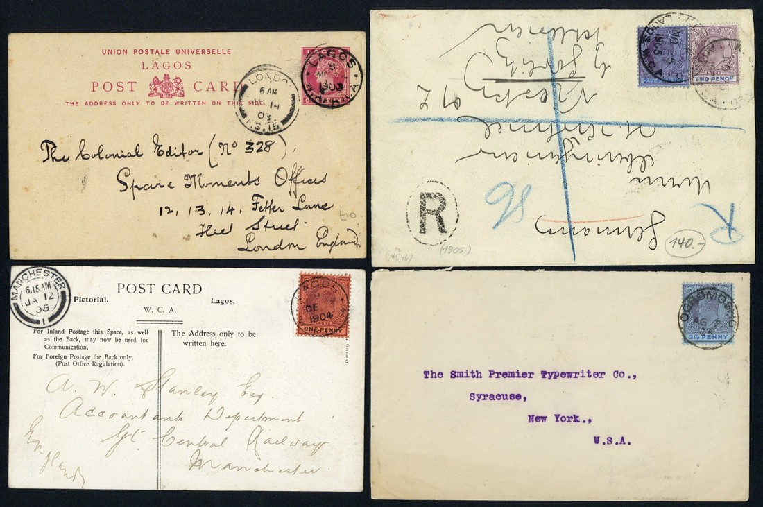 1898 (15 Aug.) 2d. registered envelope to Manchester, marked "Per Benin", uprated with 1892 ½d. (3) and 1d., all tied by "opobo" squared-circle d.s. (Type D4) and showing arrival c.d.s. (2.9) on reverse. Attractive. Photo
