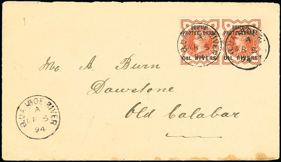 1894 (5 Mar.) envelope to Old Calabar, bearing 1892 ½d. pair clearly tied by "qua iboe river" c.d.s. with code "A" (Type D1), showing another strike in opposite corner with arrival d.s. (8.3) on reverse; the envelope with some small stains at bottom edge. Photo