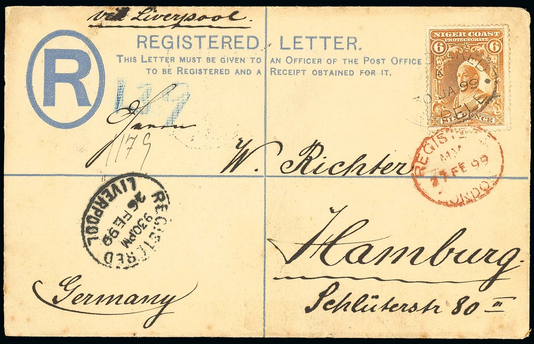 1899 (30 Jan.) 2d. registered envelope to Germany, uprated with 1897-98 6d. and tied by "registered/sapele" oval d.s. with code "A" (Type R1), showing Liverpool transit d.s. with Hamburg arrival c.d.s. (28.2) on reverse. Photo
