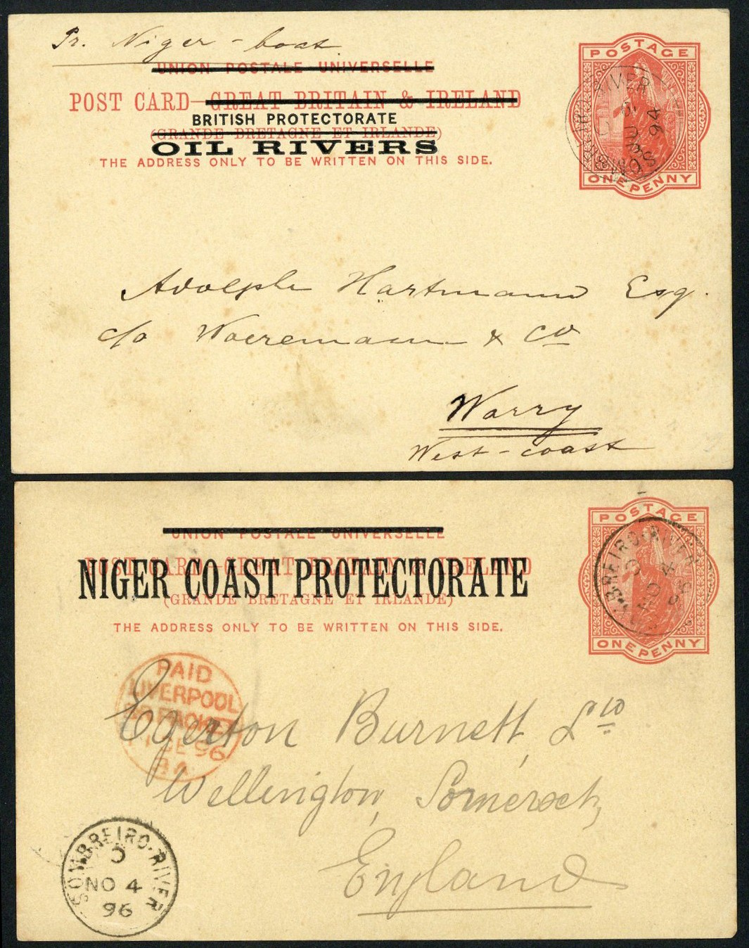 1894 (9 June) 1d. stationery card to Warri, marked "pr Niger boat" and cancelled by light "sombriero river" c.d.s. with code "C" (Type 2); and 1896 (4 Nov.) 1d. stationery card to Somerset cancelled by light "sombreiro river" c.d.s. with reversed code "C" (Type D2)