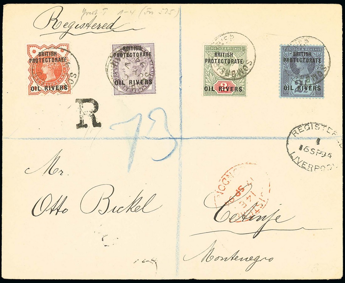 1894 (7 July) "Bickel" envelope registered to Montenegro, bearing 1892 ½d., 1d., 2d. and 2½d., each tied by "sombreiro river" c.d.s. with code "C" (Type D2), showing "R" h.s. (Type R7; fifteen months earlier than recorded), Liverpool and London transit d.s. and, on reverse, Bonny River transit c.d.s. (8.8). Photo