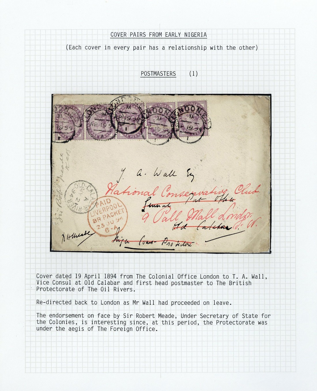 1894 (19 Apr.) envelope from London to T.A. Wall the Vice-Consul at Old Calabar and re-addressed back to London, bearing 1d. lilac (5) tied by hooded d.s., showing clear "old calabar" arrival c.d.s. (2.5) and Paid Liverpool Br Packet c.d.s.; the envelope with some minor peripheral soiling