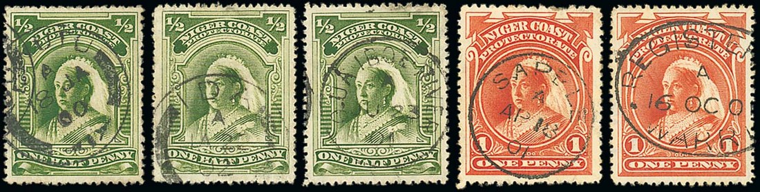 A collection of Waterlow issues loose stamps/pieces showing wide range of types for Agberi (7), Akassa (11), Asaba (14, one a 10/-), Bakana, Benin City (2), Benin River, Bonny (4), Bonny River (16), Brass (2), Brass River (2), Burutu (2), Forcados (5), Forcados River (18), Ida (4), Lagos (4), Lokoja (2), Opobo (4), Old Calabar (6), Old Calabar River (29), Oniitsha (red manuscript), Opobo River (7), Qua Iboe River (4), Sapele (14), Sombreiro River (4) and Warri (6), mostly good to fine strikes. Photo for selection