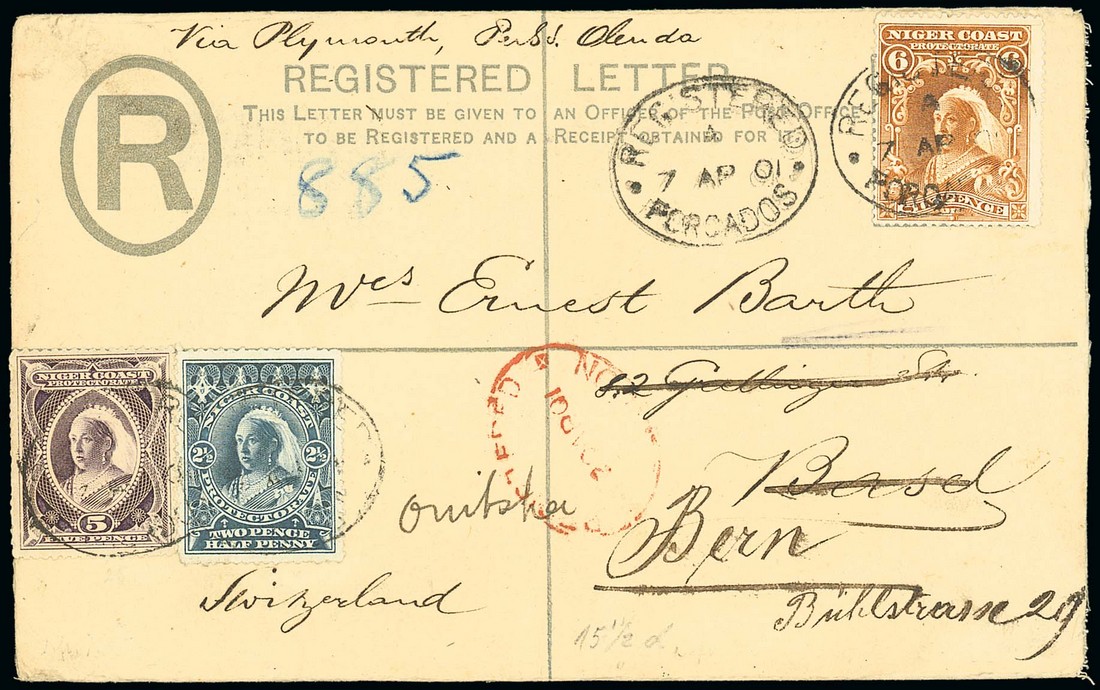 1901 (7 Apr.) 2d. registered envelope written from Onitsha to Basel and redirected to Berne, bearing re-issued 1897-98 2½d., 5d. and 6d., all tied by "registered/forcados" oval d.s. (Type R2), showing red London transit d.s. with arrival c.d.s. (30.4) on reverse; the envelope with some surface damage to stamp impression and with light central vertical fold. The 5d. is a rare stamp on cover. Photo