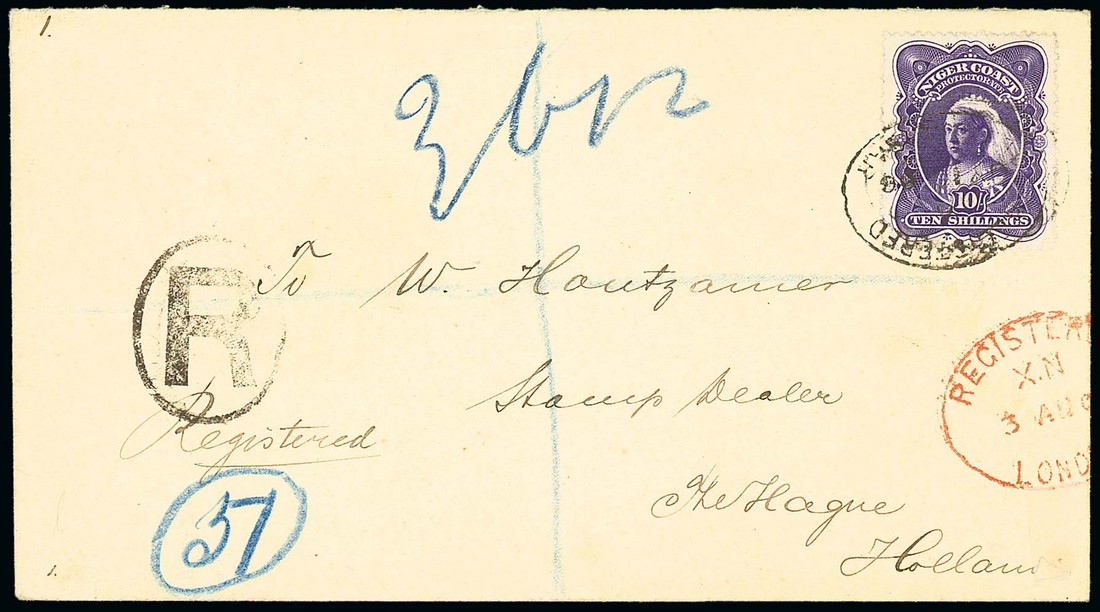 1900 (1 July) envelope registered to Holland, bearing 1897-98 10/- bright violet tied by oval "registered/old calabar" d.s. (Type R6), showing "R" in oval, part London transit d.s. in red and, on reverse, The Hague arrival c.d.s. (4.8). Photo