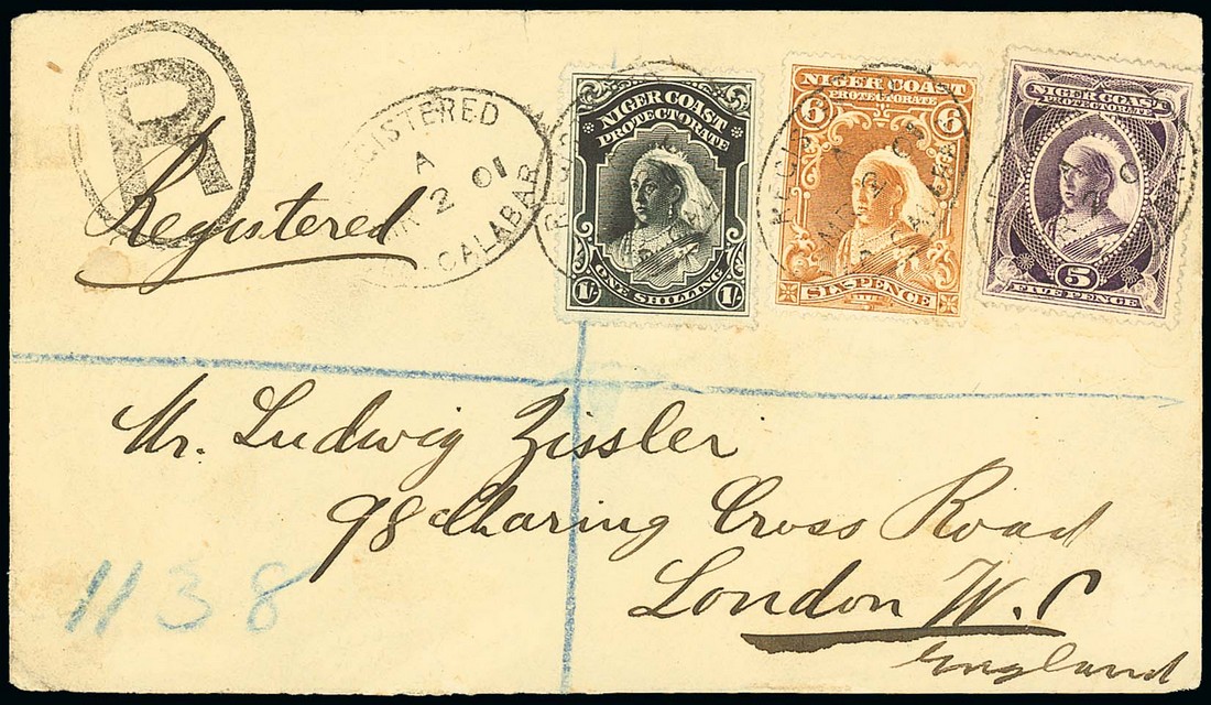 1901 (2 Mar.) "Zissler" envelope registered to London, bearing re-issued 1897-98 5d., 6d. and 1/-, all tied by "registered/old calabar" oval d.s. (Type R6), showing "R" in oval (Type R2) with arrival d.s. (1.4) on reverse. Photo