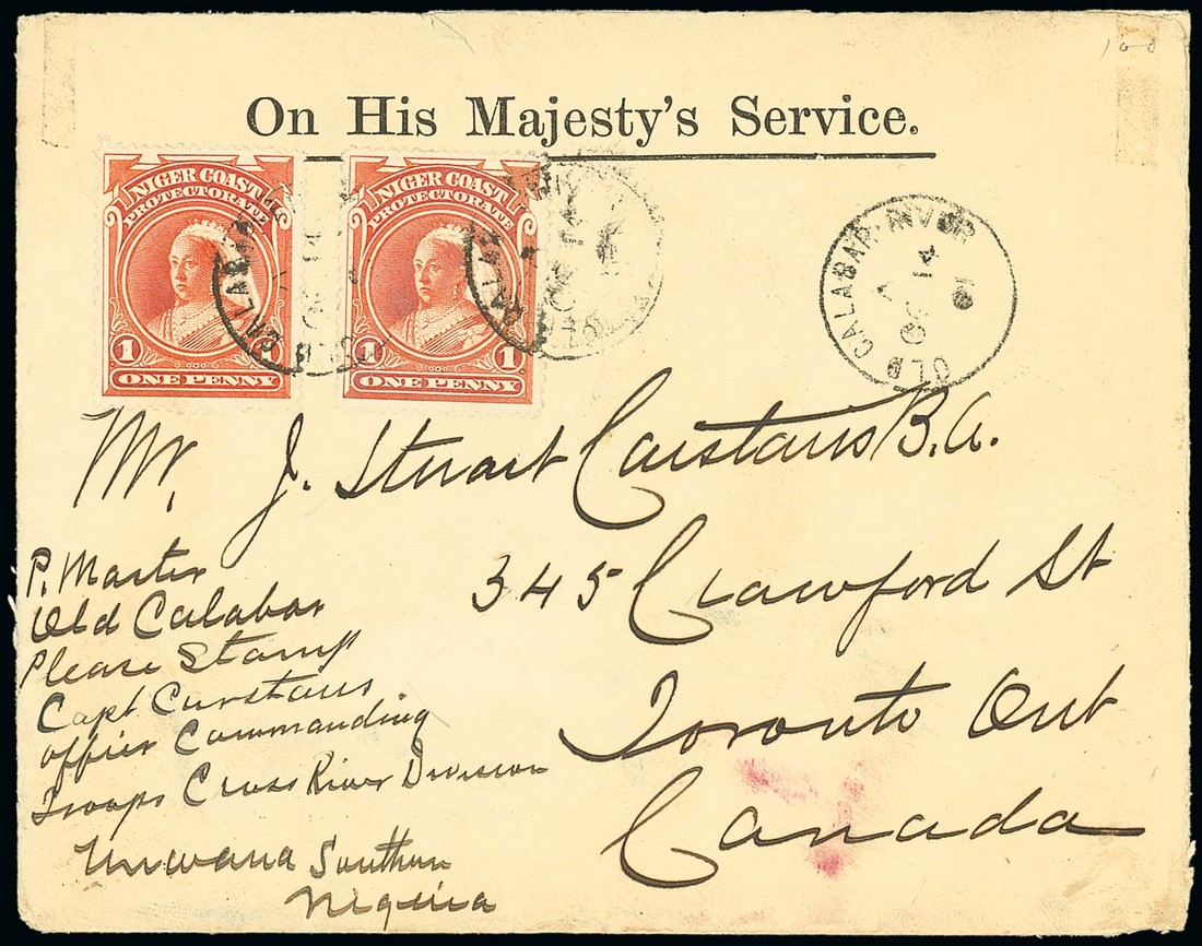 1901 (14 Oct.) OHMS envelope to Toronto, bearing re-issued 1897 1d. (2) tied by "old calabar river" c.d.s. and showing arrival d.s. (17.11) on reverse. Photo