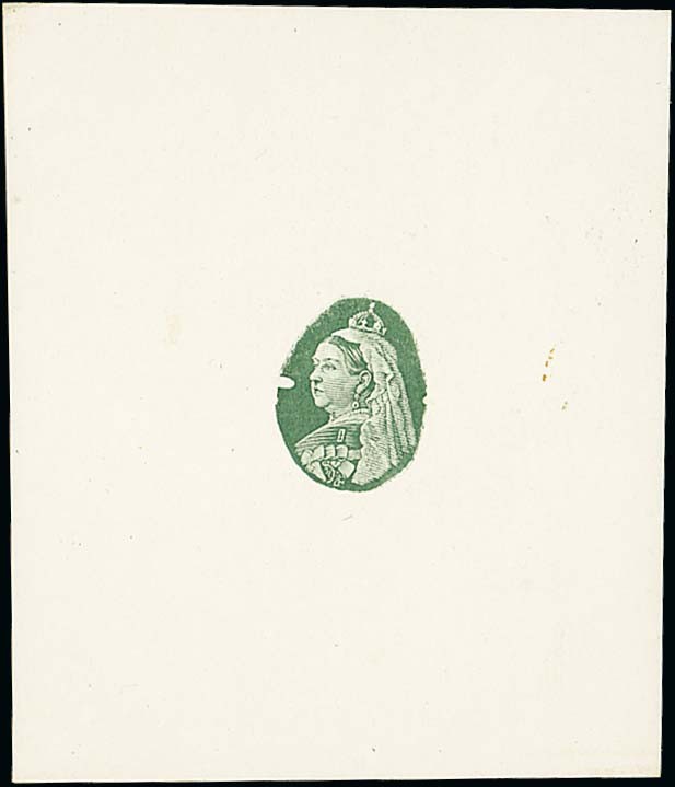Progressive proof of the Queen's head in uncleared surround showing notch marks at sides, in dull green on stout, glaze paper (51x60mm); hinge remainders on the reverse. Fresh. Photo