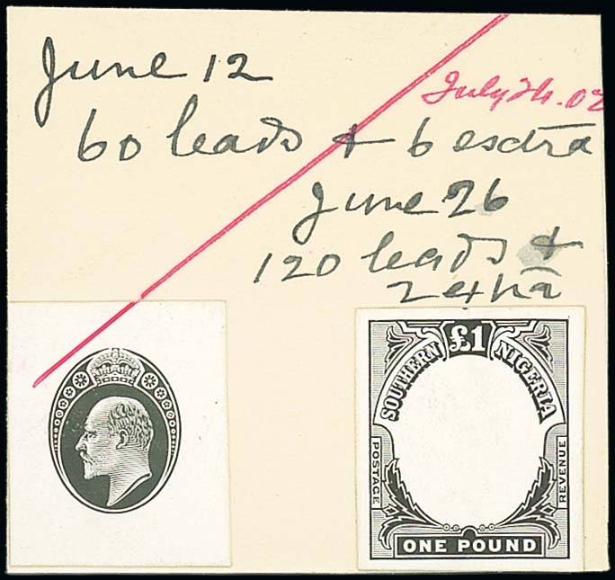 Vignette and £1 frame stamp-size die proofs from the De la Rue Day Book, manuscript "June 12, 60 leads & 6 extra ... " and, in red, "July 24 02". Photo