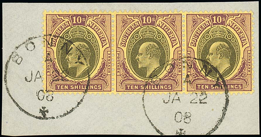 10/- grey-black and purple on yellow, a horizontal strip of three tied on piece by Bonny 1908 c.d.s.; fine. S.G. 19, £420. Photo
