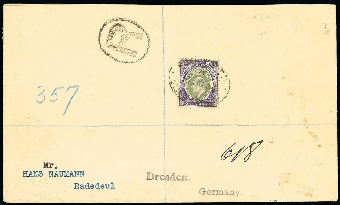£1 green and violet tied on envelope registered to Germany by Old Calabar 1904 registered oval with large "R" in oval alongside. S.G. 20. Photo
