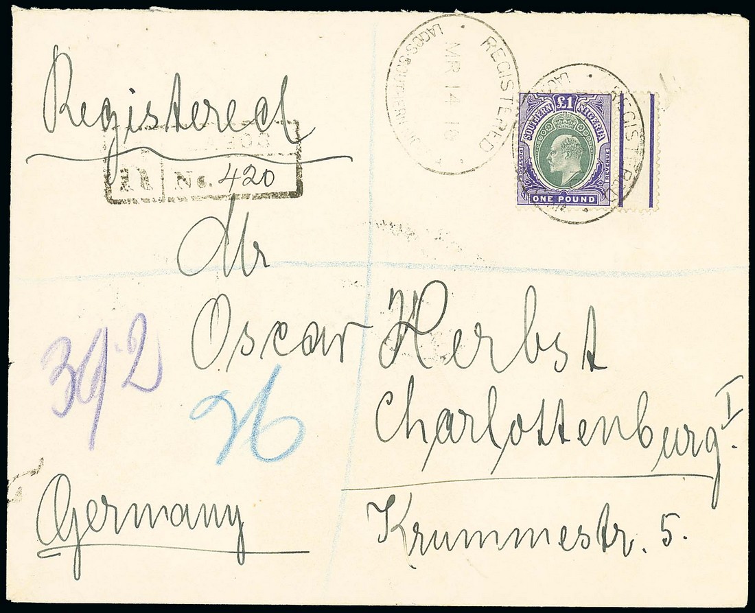 2/6d. to £1 on three covers registered from Lagos to Germany, 2/6d. and £1 with interpanneau margins; some pin holes in upper right corners. Also 1907-11 2/d. and 5/- on a similar cover. Fresh. (4 covers). Photo