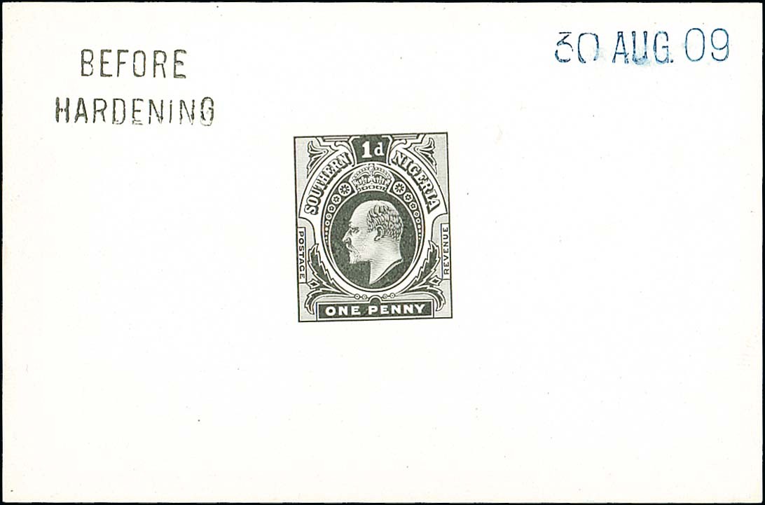 1d. Die II in black on glazed card, marked "before hardening" and dated "30 aug. 09". Fresh. Photo