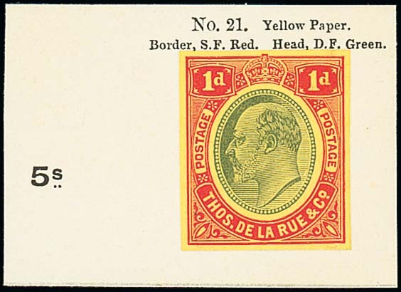 K.E.VII De la Rue 1d. in green and red on yellow, affixed to piece printed, "No. 21, Yellow Paper/ Border S.F. Red, Head D.F. Green" with "5s." at left. Photo